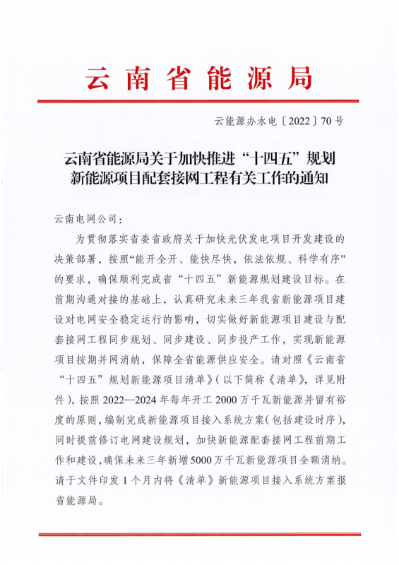 對照《云南省“十四五”規(guī)劃新能源項目清單》,按照2022-2024年每年開工2000萬千瓦新能源并留有裕度的原則,編制完成新能源項目接入系統(tǒng)方案(包括建設(shè)時序),同時提前修訂電網(wǎng)建設(shè)規(guī)劃,加快新能源配套接網(wǎng)工程前期工作和建設(shè),確保未來三年新增5000萬千瓦新能源項目全額消納。并要求文件印發(fā)1個月內(nèi)將《清單》新能源項目接入系統(tǒng)方案報省能源局。
