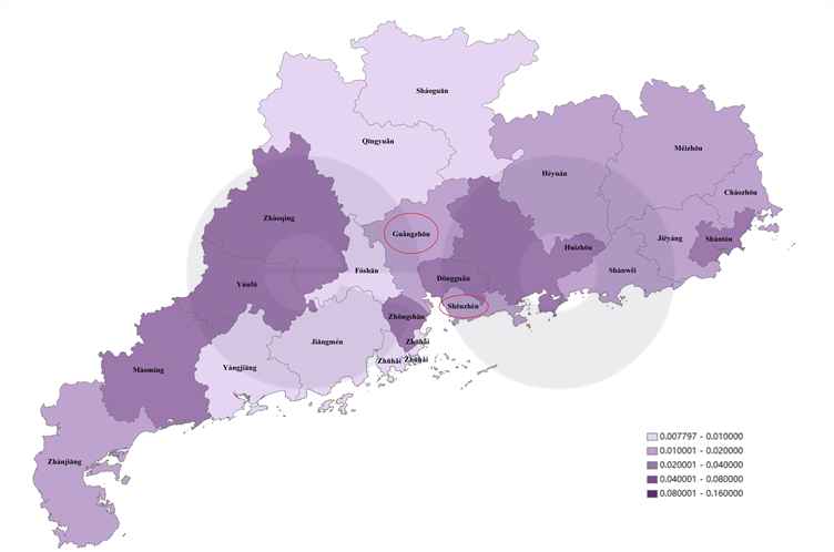 研究發(fā)現(xiàn),惠州、東莞、中山和汕頭等區(qū)域市場勢力較大的城市均位于廣州和深圳(圖中紅圈部分)周圍。由于廣州和深圳的用電量占全省30%以上,當(dāng)電能量從周邊城市輸送到廣州和深圳時,增加了周圍城市所需的負(fù)荷;同時,電力輸送面臨阻塞的風(fēng)險,進(jìn)而產(chǎn)生了區(qū)域市場勢力。圖8b有效說明了全省電力負(fù)荷較高時,廣州和深圳周邊廣泛的城市受到區(qū)域市場勢力的影響,在與廣州和深圳緊密相連的東北區(qū)域,這一影響尤為突出。