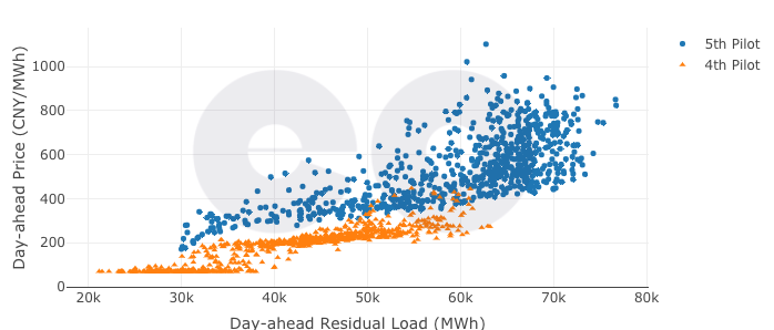 據(jù)估算,在第四輪試運(yùn)行期間,每增加1000MW的負(fù)荷平均導(dǎo)致現(xiàn)貨價格增加7元/MWh,而這一數(shù)字在第五輪試運(yùn)行期間漲到了13元/MWh。造成這一變化的原因可能是第五輪試運(yùn)行中的剩余負(fù)荷已經(jīng)接近市場的最大容量,導(dǎo)致市場競爭性減弱。參與競價的邊際機(jī)組通過更高的競價提高利潤,導(dǎo)致了更陡峭的供給曲線。