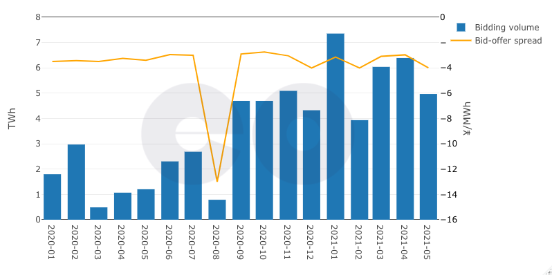 圖5展示了月度競價電量以及競價價差(月度競價與煤電標(biāo)桿電價的差)。2020年8月,競價價差下跌至-13元/兆瓦時,遠(yuǎn)低于其他月份。原因是2020年8月開展了第四輪現(xiàn)貨市場試運(yùn)行——現(xiàn)貨市場的引入增加了發(fā)電行業(yè)的競爭,一定程度上削弱了月度競價中的串謀行為?,F(xiàn)貨市場也為電力零售商提供了緩沖,即使他們未能在月度競價中簽訂合約,仍然可以在現(xiàn)貨市場購買電能量。