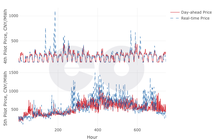 圖4展示了兩輪試運(yùn)行期間,日前和實(shí)時市場價格的動態(tài)變化。第四輪現(xiàn)貨市場試運(yùn)行的價格周期性以日為單位較為明顯,但在第五輪中這一特征消失,且價格具有不規(guī)則波動的特點(diǎn)。此外,除了少數(shù)幾個時段外,第四輪的日前與實(shí)時價格具有明顯的趨同性,但在第五輪中,這一特點(diǎn)消失,且更為頻繁地出現(xiàn)極端價格。