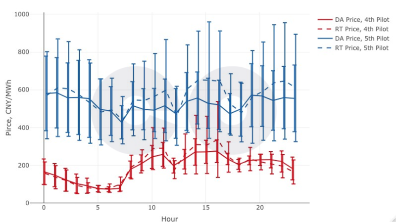 圖3展示了日前市場(DA)以及實(shí)時市場(RT)各小時的平均現(xiàn)貨價格,以及試運(yùn)行期間價格的波動情況(垂直長條代表標(biāo)準(zhǔn)差)。可見,第五輪現(xiàn)貨市場價格波動比第四輪更大,實(shí)時現(xiàn)貨市場價格波動比日前市場更大。這也就意味著對于零售商來說,第五輪的交易風(fēng)險比第四輪更高,同時實(shí)時市場的交易風(fēng)險比日前市場更高。