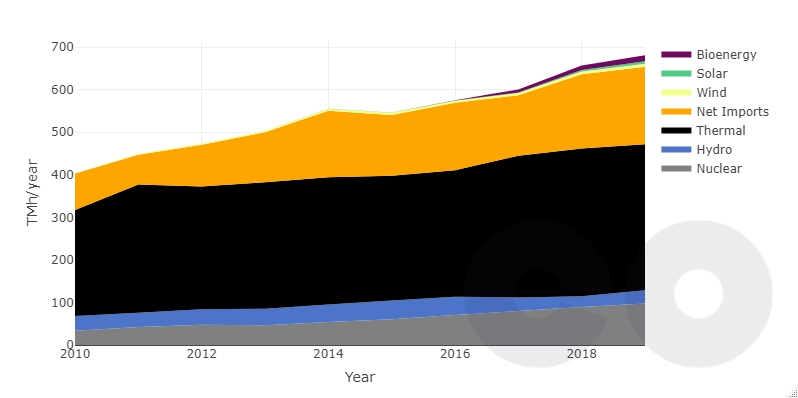 廣東按燃料類型劃分的年電力供應(yīng)量