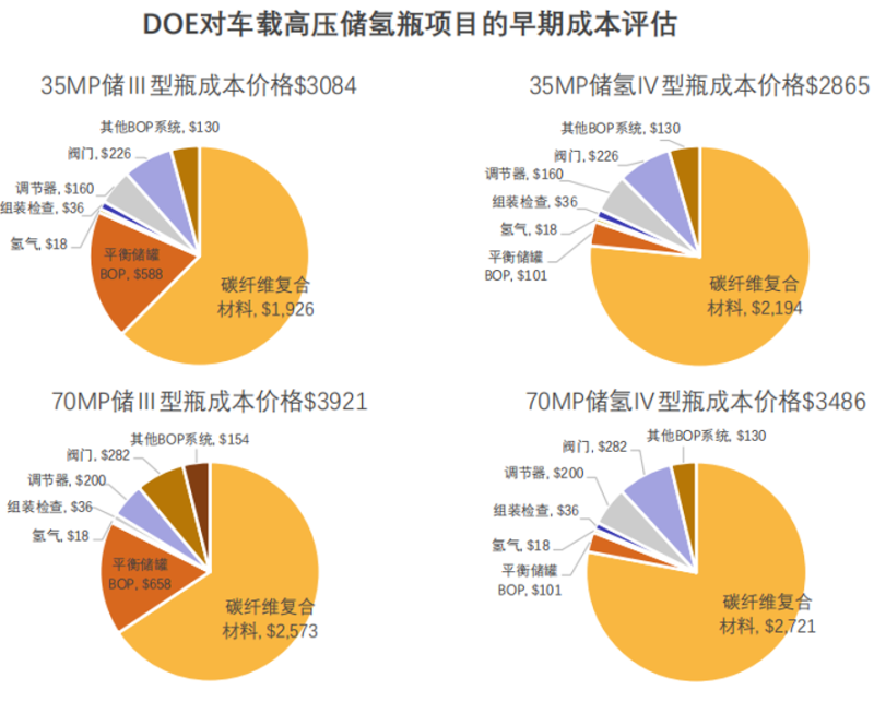 根據(jù)DOE對(duì)車載高壓儲(chǔ)氫瓶項(xiàng)目的早期成本評(píng)估可以發(fā)現(xiàn),無論是35MPa,亦或是70MPa,總體而言,III型高壓儲(chǔ)氫氣瓶成本都要略高于IV型,其主要原因在于,III型瓶?jī)?chǔ)罐采用大量金屬鋁材料。