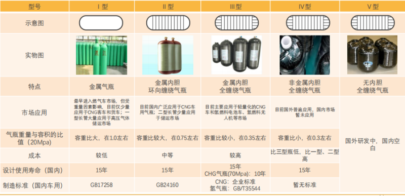 目前從技術(shù)角度看,高壓氣態(tài)儲(chǔ)氫容器主要分為純鋼制金屬瓶(I型)、鋼制內(nèi)膽纖維纏繞瓶(II型)、鋁內(nèi)膽纖維纏繞瓶(III型)及塑料內(nèi)膽纖維纏繞瓶(IV型)四級(jí)別產(chǎn)品。