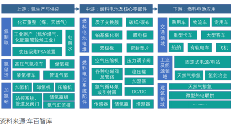 其中,上游原材料包括鋁材、鋼材、碳纖維和樹脂等,零部件包括各種金屬閥門和各類傳感器;中游生產(chǎn)制造設(shè)備和制造工藝等;下游則是在燃料汽車、氫氣運(yùn)輸罐、加氫站等場(chǎng)景上的應(yīng)用。