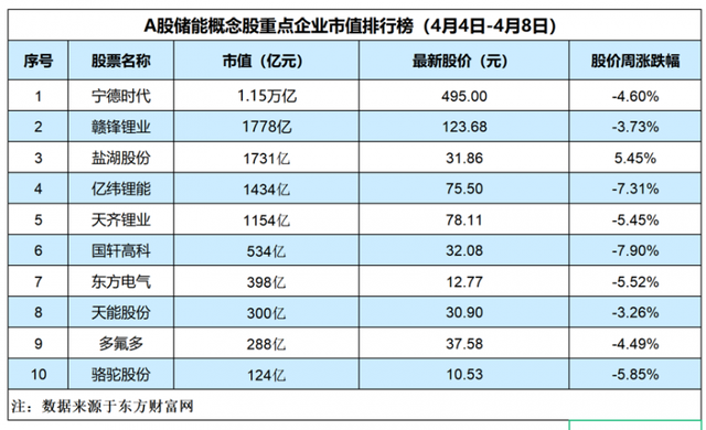 中國儲能網(wǎng)訊:正值春暖花開之際,儲能概念板塊卻異常清冷,板塊已連續(xù)六周下跌。本周(4月6日-4月8日),東方財富儲能概念板塊繼續(xù)延續(xù)跌勢,周內(nèi)多個交易日板塊出現(xiàn)下探后拉?!度A夏時報》記者重點監(jiān)測的10家企業(yè)中,僅有鹽湖股份1家上漲,其余9家全部下跌。寧德時代股價更是跌破500元大關(guān),為495元每股,市值蒸發(fā)近百億。
