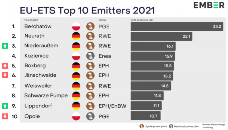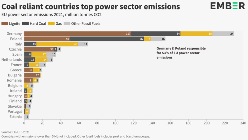 2021年德國(guó)和波蘭占?xì)W盟電力部門的排放的53%。在波蘭,電力部門85%的排放來(lái)自煤炭。目前,德國(guó)電力行業(yè)75%的排放來(lái)自硬煤和褐煤電廠。與波蘭不同的是,德國(guó)承諾到2035年實(shí)現(xiàn)電力脫碳,最近還發(fā)布了雄心勃勃的計(jì)劃,期望將清潔能源份額從目前的40%提高到2030年的80%。
