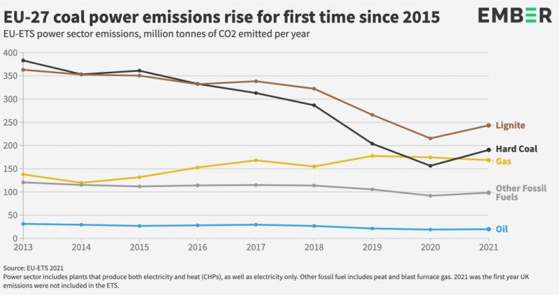 在歐盟電力行業(yè),油價(jià)上漲導(dǎo)致煤炭在2021下半年變得更具經(jīng)濟(jì)競(jìng)爭(zhēng)力,增加了褐煤和硬煤電廠發(fā)電量。2021年,歐盟的天然氣發(fā)電量下降了5%,煤電增長(zhǎng)了20%,因?yàn)槊禾吭诮?jīng)濟(jì)上更加有利。隨著新冠疫情后的經(jīng)濟(jì)反彈,2021年歐盟電力部門的排放量增加了10%,達(dá)到7.2億噸。2021年煤炭排放量上升了17%,是自EU-ETS自2005開始以來(lái)的最大增幅,也是自2015以來(lái)的首次增長(zhǎng)。煤炭排放量的增加導(dǎo)致排放歐盟國(guó)家二氧化碳排放比2020年多6200萬(wàn)噸,其中4900萬(wàn)噸來(lái)自德國(guó)和波蘭。硬煤和褐煤電廠的排放占ETS排放總量的31%,高于2020年的29%。