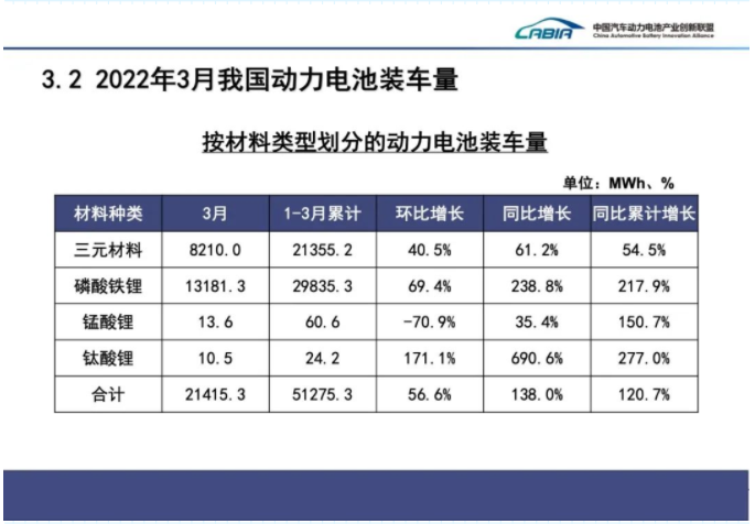 分類別來看,3月三元電池共計(jì)裝車8.2GWh,占總裝車量38.3%,同比上升61.2%,環(huán)比上升40.5%;磷酸鐵鋰電池共計(jì)裝車13.2GWh,占總裝車量61.6%,同比上升238.8%,環(huán)比上升69.4%。產(chǎn)量方面,3月三元電池產(chǎn)量15.6GWh,占總產(chǎn)量39.7%,同比增長167.3%,環(huán)比增長33.8%;磷酸鐵鋰電池產(chǎn)量23.6GWh,占總產(chǎn)量60.2%,同比增長332.9%,環(huán)比增長17.6%。可見無論裝車量還是產(chǎn)量,相較三元電池,磷酸鐵鋰電池增速都明顯更高。