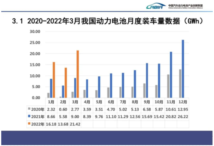 具體來看,3月我國動(dòng)力電池裝車量達(dá)21.4GWh,同比上漲138%,環(huán)比增長56.6%。這與3月新能源汽車整體銷量情況大體一致。據(jù)中汽協(xié)數(shù)據(jù),3月新能源汽車銷量為48.4萬輛,同比增長1.1倍。