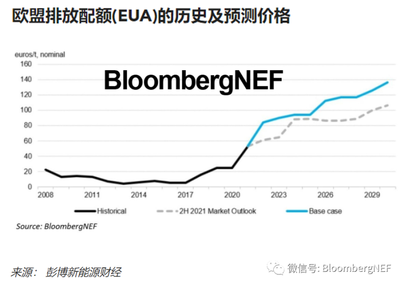 中國(guó)儲(chǔ)能網(wǎng)訊:我們依據(jù)歐盟排放交易體系(EU ETS)在第四個(gè)交易階段的預(yù)期變化,按目前的趨勢(shì)歐盟碳價(jià)格預(yù)計(jì)將在2030年達(dá)到創(chuàng)紀(jì)錄的每噸136歐元?!癋it for 55”系列立法提案是自2019年推出市場(chǎng)穩(wěn)定儲(chǔ)備(MSR)以來最為重要的政策改革,該提案提出了全新的線性折減系數(shù)和一次性調(diào)整方案,目的是讓碳市場(chǎng)與歐盟范圍內(nèi)2030年減排目標(biāo)上調(diào)至55%的舉措保持一致。在彭博新能源財(cái)經(jīng)的基準(zhǔn)情景中,2022年至2030年的平均碳價(jià)格為每噸108歐元,比2021年下半年市場(chǎng)展望預(yù)計(jì)的每噸83歐元要高出約30%。