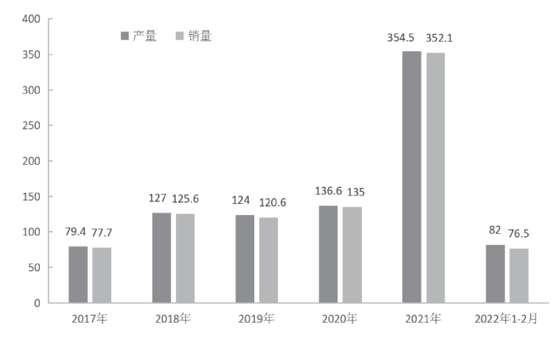 圖1 2017~2022年2月中國新能源汽車產銷情況(單位:萬輛)