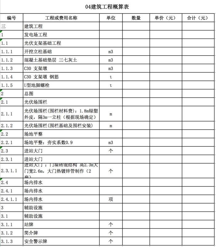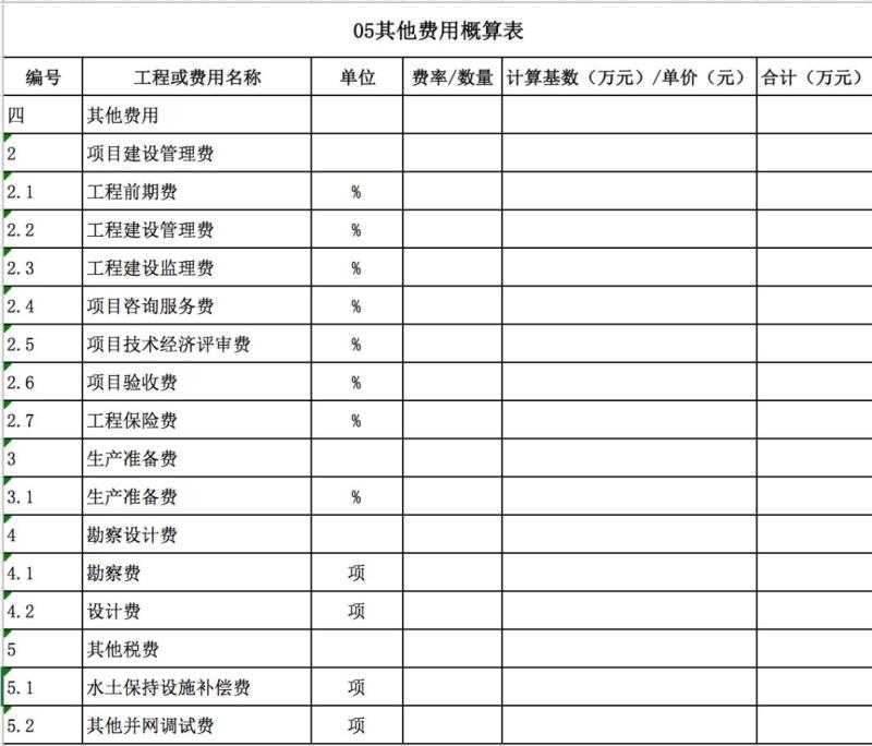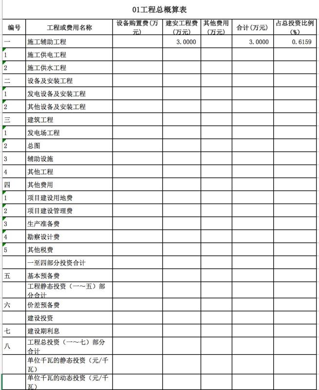 包含:發(fā)電廠區(qū)工程、變電站工程、房屋工程、交通工程等費(fèi)用。如下表所示。