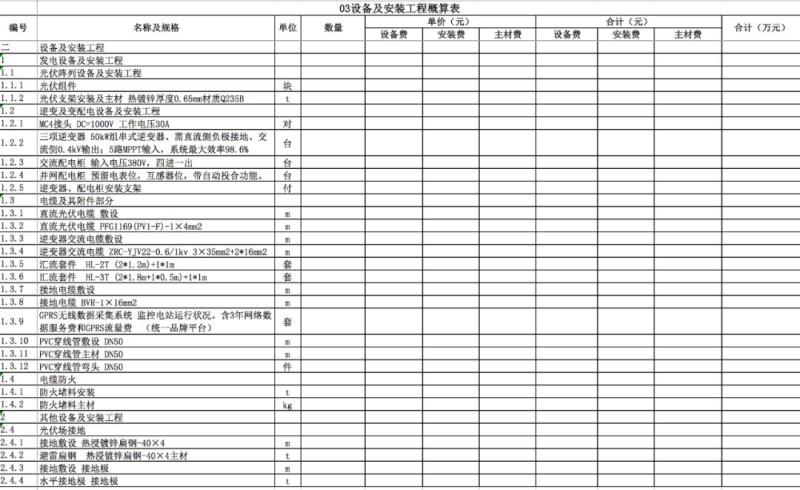 包含:發(fā)電設(shè)備(組件、逆變器、支架、電纜、接地)、升壓變電站設(shè)備、通信設(shè)備及其他設(shè)備的購買及安裝費(fèi)用。如下表所示。(某電站的電氣設(shè)備項(xiàng)目附后)