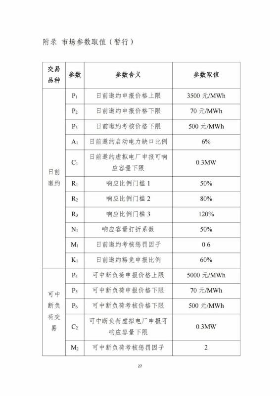現(xiàn)階段可響應時段默認為所發(fā)布的需求響應時段。響應價格現(xiàn)階段響應價格為9單段報價,具備條件后可啟用多段報價。日前邀約申報價格上限為3500元/MWh;日前邀約虛擬電廠申報可響應容量下限0.3MW,可中斷負荷申報價格上限為5000元/MWh;可中斷負荷虛擬電廠申報可響應容量下限為0.3MW。