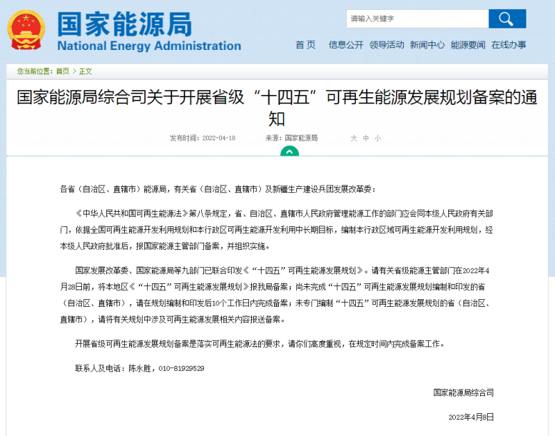 國(guó)家發(fā)展改革委、國(guó)家能源局等九部門已聯(lián)合印發(fā)《“十四五”可再生能源發(fā)展規(guī)劃》。請(qǐng)有關(guān)省級(jí)能源主管部門在2022年4月28日前,將本地區(qū)《“十四五”可再生能源發(fā)展規(guī)劃》報(bào)我局備案;尚未完成“十四五”可再生能源發(fā)展規(guī)劃編制和印發(fā)的省(自治區(qū)、直轄市),請(qǐng)?jiān)谝?guī)劃編制和印發(fā)后10個(gè)工作日內(nèi)完成備案;未專門編制“十四五”可再生能源發(fā)展規(guī)劃的?。ㄗ灾螀^(qū)、直轄市),請(qǐng)將有關(guān)規(guī)劃中涉及可再生能源發(fā)展相關(guān)內(nèi)容報(bào)送備案。