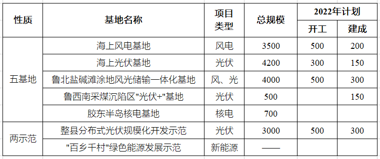 3月3日,山東省能源局印發(fā)《2022年全省能源工作指導(dǎo)意見(jiàn)的通知》中,提出“五基地二示范”的概念,各項(xiàng)工程規(guī)模規(guī)劃如下表所示。
