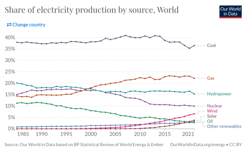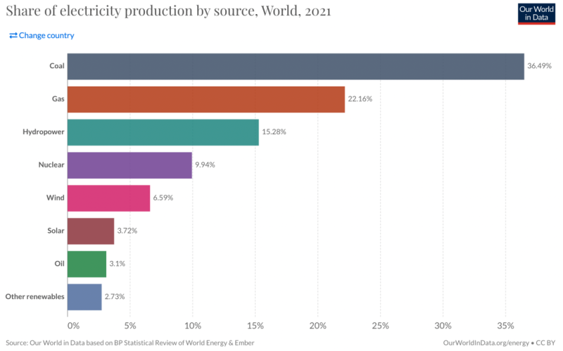 中國儲能網(wǎng)訊:據(jù)Our World in Data網(wǎng)站匯總數(shù)據(jù),2021年全球電力結(jié)構(gòu)(比例%)如下: