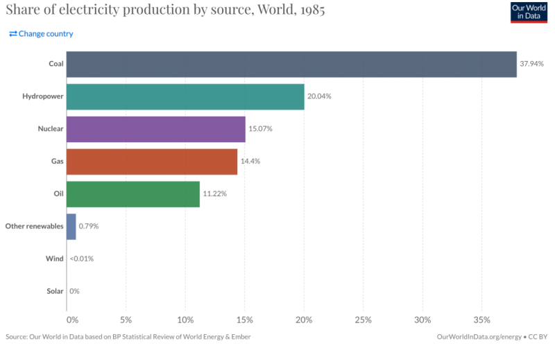 而1985年的全球電力結(jié)構(gòu)(比例%)如下: