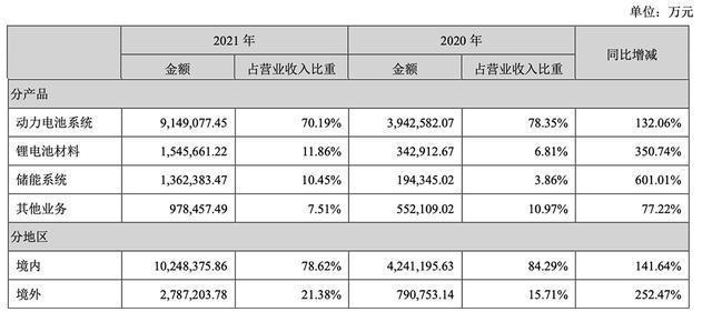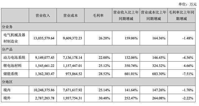 財報顯示,寧德時代核心業(yè)務(wù)分為動力電池系統(tǒng)、鋰電池材料和儲能系統(tǒng)等;去年動力電池系統(tǒng)營業(yè)收入為914.9億元,同比增長132.06%,占總營業(yè)收入比重超7成;鋰電池材料和儲能系統(tǒng)營業(yè)收入分別同比增長超3.5倍、6倍至154.6億元、136.2億元。此外,去年寧德時代海外市場業(yè)務(wù)也實現(xiàn)了高速增長,營業(yè)收入為278.7億元,同比增長2.5倍;營收占比由去年同期的15.71%增長至221.38%,境外毛利率為30.48%,高于境內(nèi)。