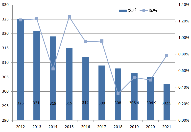 據(jù)國家能源局?jǐn)?shù)據(jù),2021年全國供電標(biāo)準(zhǔn)煤耗302.5克/千瓦時(shí),同比再降2.4克/千瓦時(shí),較2011年下降了26.5克/千瓦時(shí)。