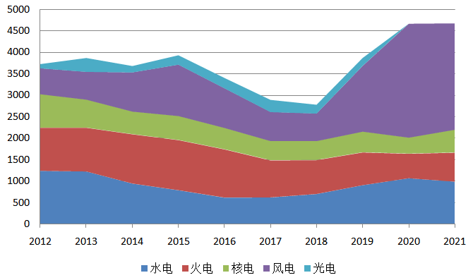 圖10 2012~2021年新增風(fēng)電、太陽能發(fā)電裝機(jī)情況(單位:萬千瓦)