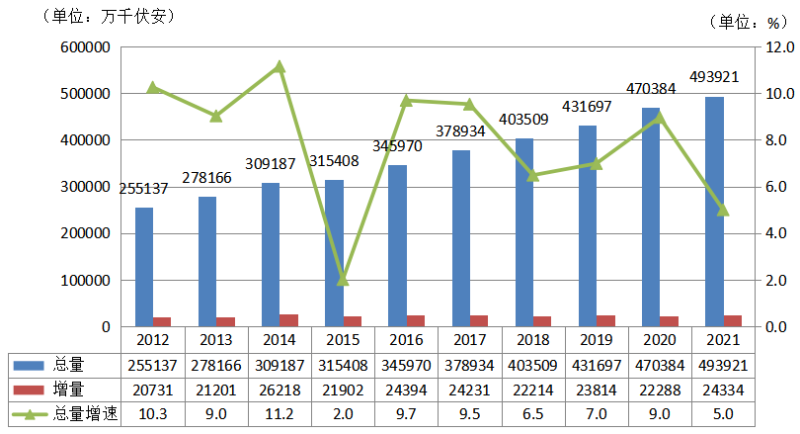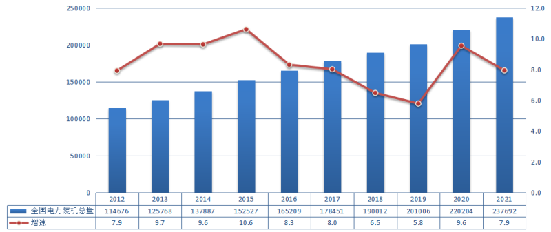 圖4 2012~2021年全國電力裝機(jī)及增速情況(單位:萬千瓦,%)