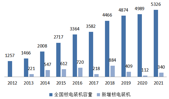 圖11 2012~2021年核電裝機(jī)和新增裝機(jī)情況(單位:萬千瓦)