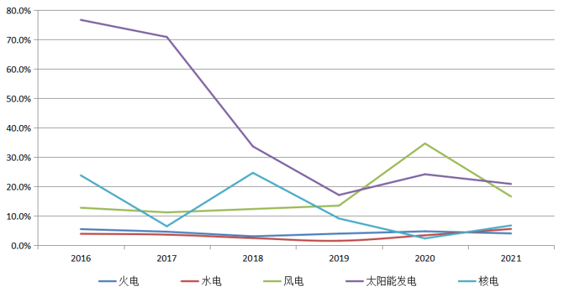 圖6 2016~2021年火電、水電、風(fēng)電、太陽能發(fā)電、核電裝機(jī)增速情況