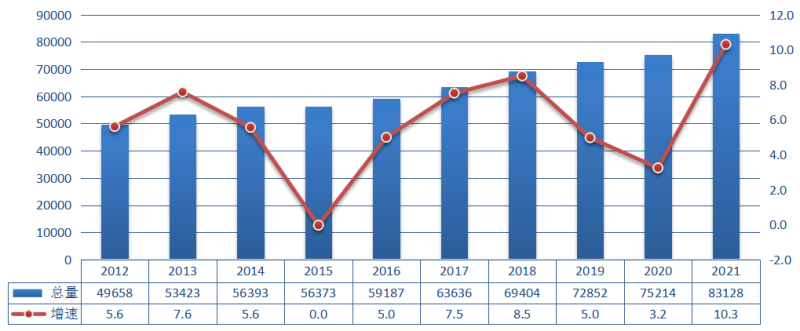 圖1 2012~2021年全國全社會用電量及增速情況(單位:億千瓦時(shí),%)