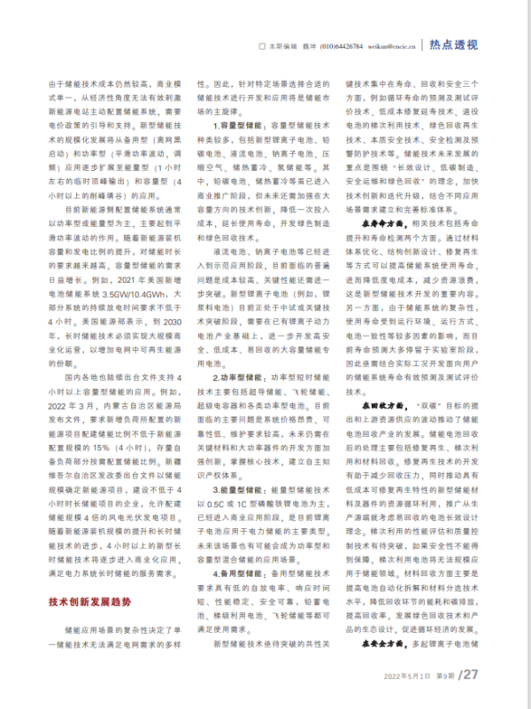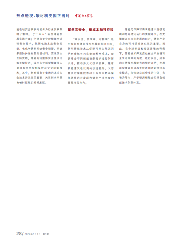 “高安全、低成本、可持續(xù)”是所有新型儲(chǔ)能技術(shù)發(fā)展的共同目標(biāo)。新型儲(chǔ)能技術(shù)從促進(jìn)可再生能源消納到降低可再生能源利用成本,需要結(jié)合不同儲(chǔ)能場景需求進(jìn)行創(chuàng)新設(shè)計(jì),推動(dòng)多元化技術(shù)發(fā)展。隨著新能源發(fā)電比例的快速提升,大容量長時(shí)儲(chǔ)能技術(shù)和長壽命大功率儲(chǔ)能器件的開發(fā)成為儲(chǔ)能產(chǎn)業(yè)亟需的重要攻關(guān)方向。