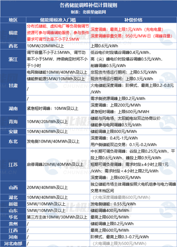 各省儲能調(diào)峰補償計算規(guī)則如下: