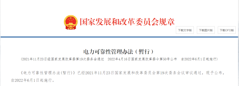 《電力可靠性管理辦法(暫行)》已經(jīng)2021年11月23日國家發(fā)展和改革委員會(huì)第19次委務(wù)會(huì)議審議通過,現(xiàn)予公布,自2022年6月1日起施行。