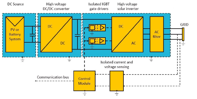 第7節(jié)中涵蓋的安全標(biāo)準(zhǔn)適用于充電器/逆變器。通常情況下,在這些簡(jiǎn)單的DC到AC(例如太陽能發(fā)電設(shè)施)應(yīng)用中使用的逆變器是“無變壓器”的,這意味著該單元的DC-DC側(cè)和AC逆變器側(cè)之間沒有物理分離。與其相反,安全隔離是通過隔離交流逆變器的控制(例如IGBT類型設(shè)備的柵極信號(hào))以及電壓和電流傳感器來提供的。與控制器的通信(例如通過CAN或以太網(wǎng))也可以完全隔離,但為清楚起見,從下面的框圖中省略(參見圖5)。