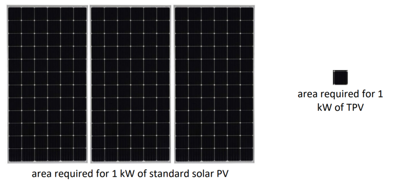 此外,TPV面板較高的能量密度和緊湊型的設(shè)計(jì),TPV面積遠(yuǎn)小于傳統(tǒng)光伏發(fā)電面板。