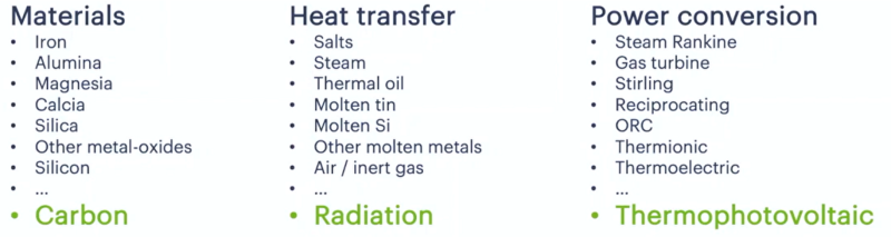 Antora Energy公司的定位是發(fā)展長時(shí)儲(chǔ)能以滿足未來大規(guī)模新能源接入對(duì)電網(wǎng)帶來的調(diào)節(jié)不足的問題,同時(shí)立足于現(xiàn)有儲(chǔ)能技術(shù)經(jīng)濟(jì)造價(jià)過高,尤其是長時(shí)間儲(chǔ)能價(jià)格翻倍的問題。因此該公司從三個(gè)方面破局,一是儲(chǔ)熱介質(zhì),尋找低造價(jià)、高能量密度的儲(chǔ)熱介質(zhì);二是熱傳遞的方式,尋找簡(jiǎn)單可靠的熱傳導(dǎo)方式;三是熱電轉(zhuǎn)換,尋找可行的熱-電轉(zhuǎn)換技術(shù)。通過大量的市場(chǎng)調(diào)研、技術(shù)分析論證,最后采用下圖所示的技術(shù)方案,儲(chǔ)熱介質(zhì)采用碳?jí)K、熱傳遞方式采用光輻射、發(fā)電方式采用光熱發(fā)電。