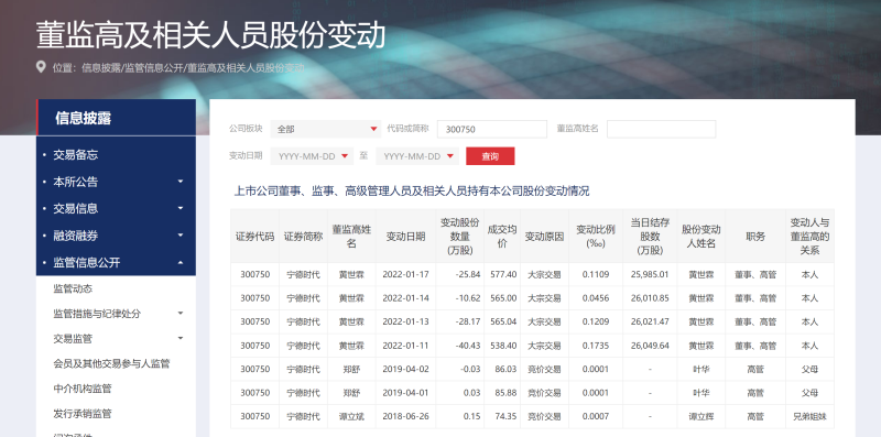 據(jù)深交所官網(wǎng)的董監(jiān)高及相關(guān)人員股份變動(dòng)查詢(xún),今年以來(lái),黃世霖通過(guò)大宗交易累積變動(dòng)4次股份,成交均價(jià)在538.4元/股至577.4元/股之間。