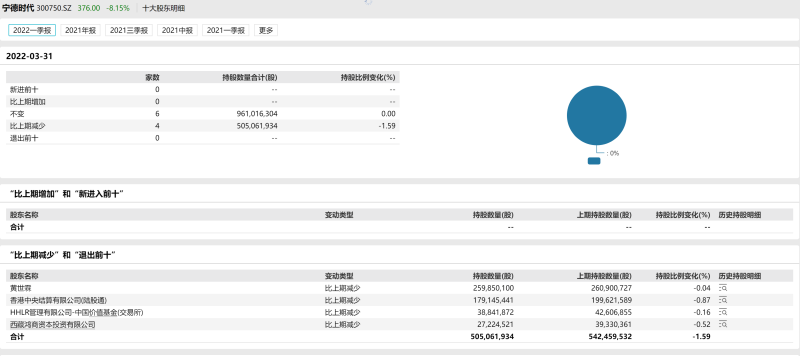 Wind數(shù)據(jù)顯示,今年一季度末相較于去年底,黃世霖、香港中央結(jié)算有限公司、HHLR管理有限公司-中國(guó)價(jià)值基金(交易所)和西藏鴻商資本投資有限公司持股數(shù)為“比上期減少”。