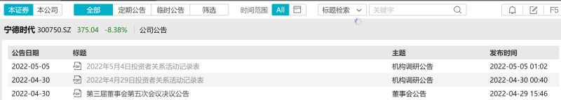 Wind數(shù)據(jù)顯示,寧德時(shí)代的《投資者關(guān)系活動(dòng)記錄表》發(fā)布時(shí)間是5月5日凌晨1點(diǎn)零2分。