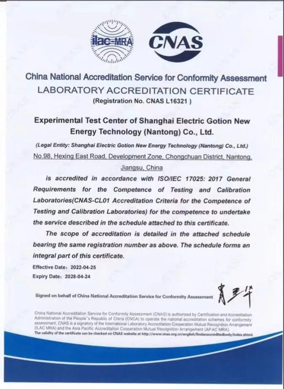 獲得認(rèn)可證書也是新的征程的開始,上海電氣國軒實(shí)驗(yàn)測試中心將持續(xù)秉承“準(zhǔn)確、及時、客觀、高效”的質(zhì)量方針,依據(jù)CNAS認(rèn)可的檢測流程與標(biāo)準(zhǔn),高效完成各項(xiàng)檢測工作,并積極拓展測試種類以滿足更多儲能產(chǎn)品研發(fā)檢測需求,推動儲能行業(yè)的健康高效發(fā)展。