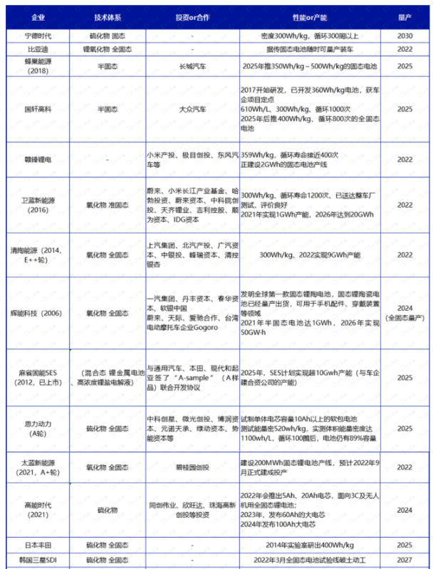 ● 國(guó)內(nèi)以鋰電巨頭和初創(chuàng)企業(yè)為主,參與者包括中科院化學(xué)所、中科院青島能源所、中科院寧波材料所等研究機(jī)構(gòu),贛鋒鋰業(yè)、寧德時(shí)代等電池企業(yè),一些汽車零部件廠商和新能源廠商也加快了進(jìn)入固態(tài)電池的跨界投資的步伐,比如萬(wàn)向集團(tuán)、比亞迪等企業(yè)。