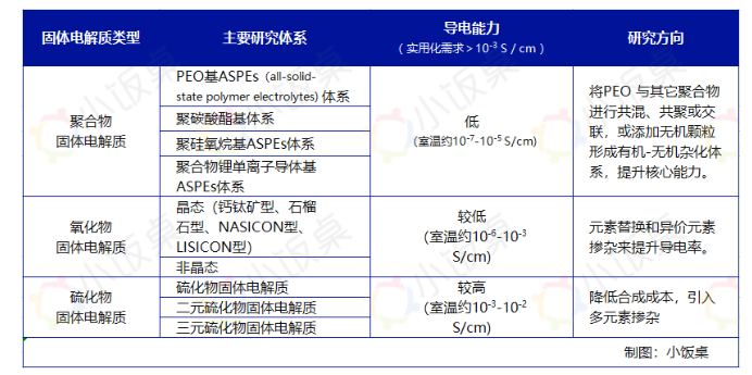 因此導(dǎo)電率成為考核固態(tài)電解質(zhì)的重要因素,在氧化物、硫化物、聚合物中,硫化物的導(dǎo)電率最高,氧化物次之,聚合物排最后。
