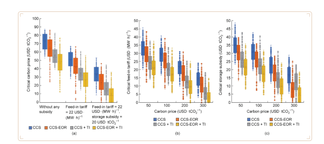 圖3 不同情景下煤電開展CCUS技術(shù)所需激勵政策的臨界值。(a)臨界碳價格;(b)臨界電價補(bǔ)貼;(c)臨界埋存補(bǔ)貼。CCS:CO2捕集、運(yùn)輸和咸水層埋存;CCS-EOR:CO2捕集、運(yùn)輸和驅(qū)油利用埋存;TI:考慮CCUS的技術(shù)進(jìn)步。