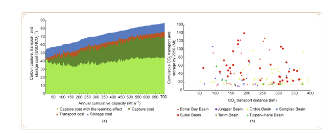圖1 成本效益結(jié)果、電廠匹配的埋存盆地運(yùn)輸距離和2050年CO2累計埋存量。(a)CO2捕集、運(yùn)輸和埋存成本與年累積捕集量的對比。x軸表示年CO2累計埋存規(guī)模;y軸表示有/無技術(shù)改進(jìn)的CO2捕集成本、CO2管道運(yùn)輸和埋存成本。(b)2050年CO2累計埋存量和輸送距離的關(guān)系。x軸表示CO2的平均輸送距離;y軸表示到2050年CO2累計運(yùn)輸埋存量。