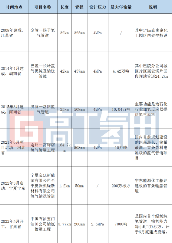 從實(shí)際建設(shè)情況來(lái)看,我國(guó)純氫管道建設(shè)處于起步階段,規(guī)模較小,總里程約400公里,已建項(xiàng)目以化工園區(qū)內(nèi)應(yīng)用為主,具體如下: