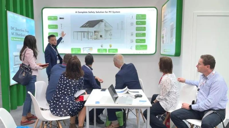 普兆展出了隔離開關(guān)、斷路器、電箱等全系列產(chǎn)品,其中客戶最感興趣的是光伏快速關(guān)斷,一種新型的消防安全“開關(guān)”,一旦有火災(zāi)隱患,它可以迅速切換光伏組件至逆變器之間的高壓直流電,甚至組件級快速關(guān)斷(PEFS-PL系列)可以切斷光伏組件之間的電流,防止火災(zāi)危險范圍擴大,給消防員營造一個安全的作業(yè)環(huán)境,保護光伏電站內(nèi)的人身和財產(chǎn)安全。其產(chǎn)品同樣適用于儲能領(lǐng)域。
