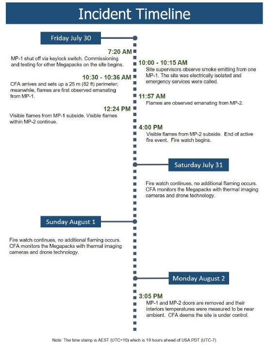 此后不久,消防人員抵達(dá)現(xiàn)場并在MP-1儲能系統(tǒng)周圍設(shè)置了安全邊界。他們還開始按照特斯拉鋰離子電池應(yīng)急響應(yīng)指南2(ERG)的建議對其附近用水冷卻。其火勢最終蔓延到MP-1相鄰15厘米的Megapack電池儲能單元(MP-2)。消防人員決定允許MP-1和MP-2自行燒毀,并且按照特斯拉的ERG中的建議沒有直接向Megapack儲能系統(tǒng)澆水。直到當(dāng)天下午4:00(火災(zāi)開始之后的大約6小時),火勢已經(jīng)熄滅,消防人員在現(xiàn)場值守直到次日,并在接下來的三天內(nèi)對該地點進(jìn)行了監(jiān)測,然后于2021年8月2日認(rèn)為事故現(xiàn)場已得到控制,并移交給調(diào)查人員開始進(jìn)行火災(zāi)調(diào)查。