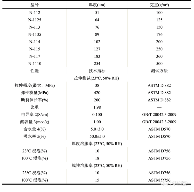 以美國杜邦公司生產(chǎn)的全氟磺酸質(zhì)子交換膜Nafion?系列膜(Nafion? 112、Nafion? 115、Nafion? 117等)為例,在中國售賣的產(chǎn)品N115和N117,其少量零售價分別為13500元/平方米和15000-19000元/平方米,批量售價也在2000-3000元/平方米。據(jù)其公開資料顯示,Nafion全氟磺酸 (PFSA) 膜是PFSA/聚四氟乙烯 (PTFE) 共聚物膜,其用于儲能方面的膜主要包括采用流延法生產(chǎn)的具有高穩(wěn)定性的NR211和NR212,其厚度分別為25.4微米和50.8微米,以及擠出法生產(chǎn)的高穩(wěn)定性的N115和N117,其厚度分別為125微米和183微米,其主要性能如下所示。在表中顯示的相關(guān)產(chǎn)品性能,NR211、NR212、N115、N117的機械方向(MD)拉伸強度分別為23MPa,32MPa,43MPa和43MPa,隨著厚度提升其拉伸強度隨之提升。相關(guān)文獻報道目前其主要電導率參數(shù)N117為0.035 S cm?1,其它Nafion的性能也在0.05-0.07 S cm?1左右,隨厚度減小而逐漸電導率增加。
