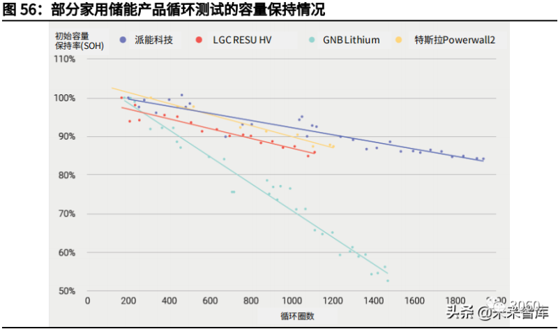 從使用壽命來看,儲能電池對于使用壽命有更高的要求,一般使用壽命需大于 10 年,需要 6000-10000 次循環(huán);而動力電池運用于新能源汽車中,新能源汽 車的壽命一般在 5-8 年,其動力電池的循環(huán)次數(shù)通常在 1000-2000 次之間。